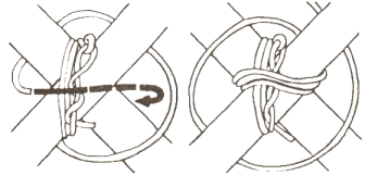 | Amarra Cruzada : Sirve para unir o juntar dos varas o palos que se encuentran formando um ángulo de aproximadamente 90°(entre 75 y 105). Sirve para reemplazar a la amarra cuadrada y a la amarra diagonal. Es muy utilizada en la construcciónes de todo tipo, portales, mesas, portabanderas, etc. Para comezar use un nudo de Saco apretando fuertemente las dos varas, de tres o cuatro vueltas alrededor de las varas en sentido del nudo de saco, luego, de tres o cuatro vueltas en sentido contrario, si lo desea remate o atortore con dos vueltas entre las varas. Termine realizando un nudo llano o Verdadero entre las puntas. | |